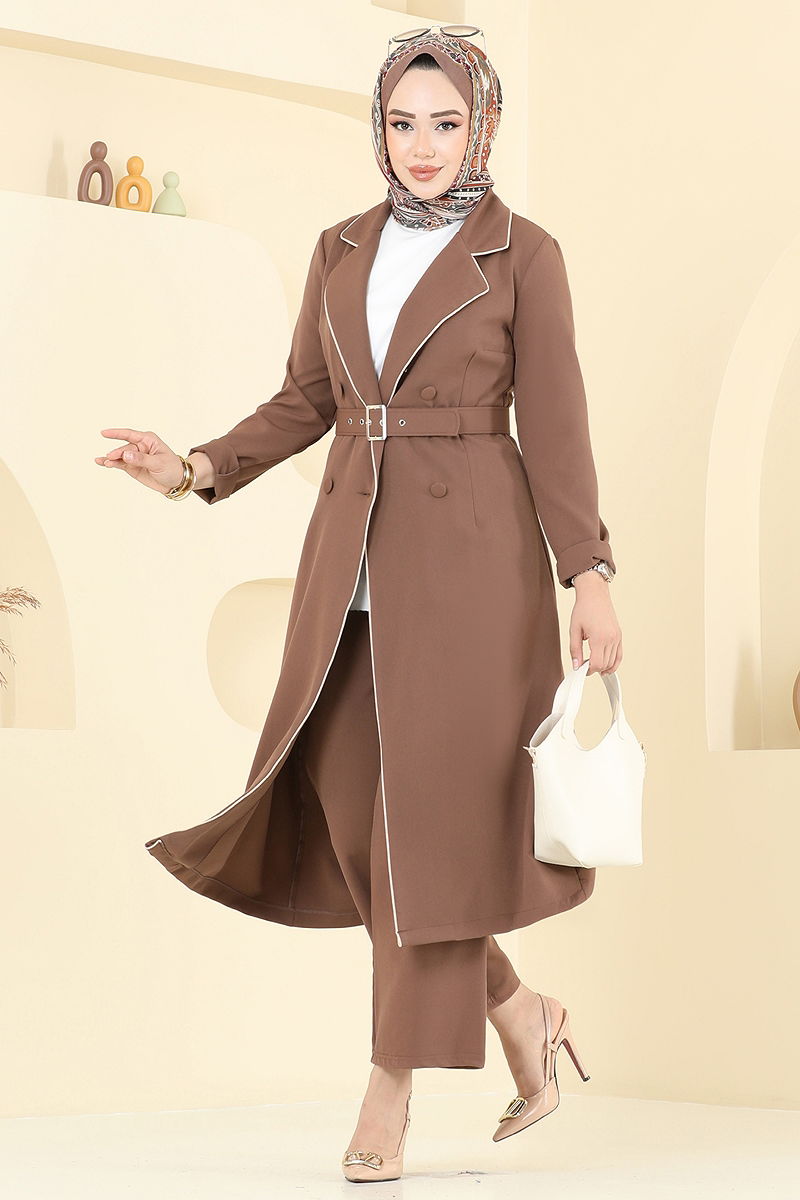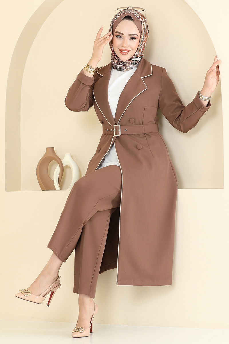 Product Feature : It is a new season hijab fashion product. There is a button available from the front. The product has a Double-breasted collar. Unlined. Buttons are accessories. Belt included, optional not available. The waist of the trousers is elastic. There may be a tonal difference in the product due to concept photo shoots.