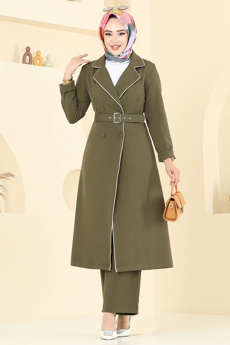 يوجد زر متاح من الأمام. المنتج لديه ياقة مفتوحة. غير مبطنة. الأزرار هي إكسسوارات. الحزام متضمن، ،يمكن استخدامها حسب الرغبة خصر البنطال مرن. قد يكون هناك اختلاف في الدرجة اللونية في المنتج بسبب التقاط الصور الفوتوغرافية.