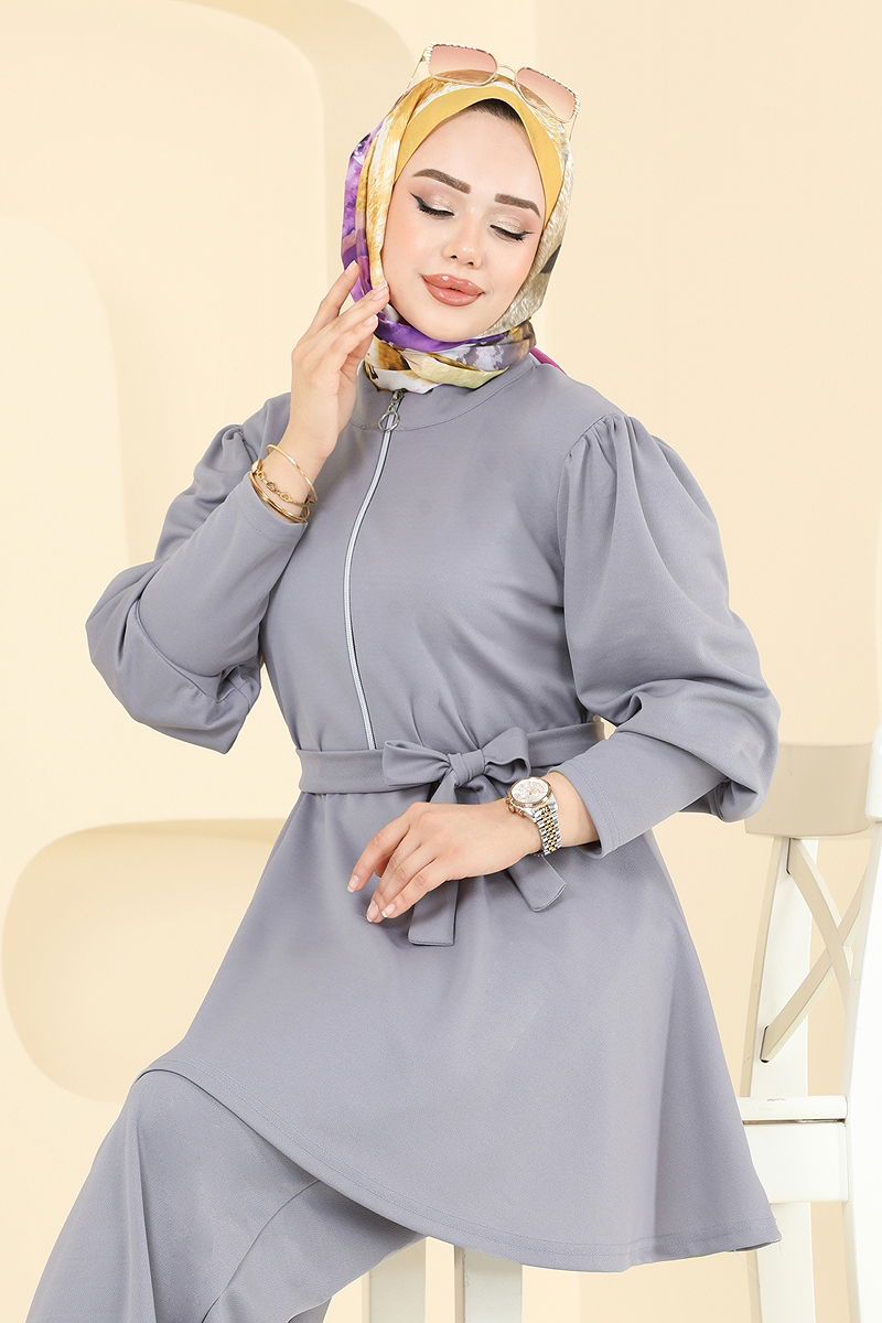 المنتج لديه ياقة نصف بيضوية. غير مبطنة. المنتج به سحاب في جزء من الأمام. الحزام متضمن، ،يمكن استخدامها حسب الرغبة خصر البنطال مرن. قد يكون هناك اختلاف في الدرجة اللونية في المنتج بسبب التقاط الصور الفوتوغرافية.