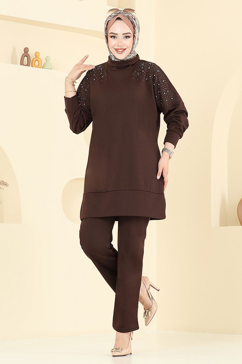 المنتج لديه ياقة عريضة. البلوز تحتوي على فتحة. غير مبطنة. تفاصيل الخرز معبئة يتم لصق الحجارة. خصر البنطال مرن. قد يكون هناك اختلاف في الدرجة اللونية في المنتج بسبب التقاط الصور الفوتوغرافية.