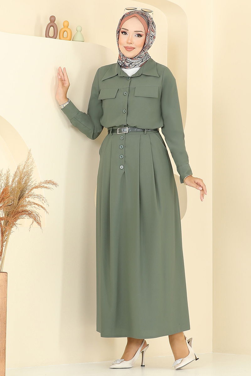 Product Feature : It is a new season hijab fashion product. The product has a Shirt collar. The product has From the front buttons. Unlined. Belt included, optional not available. Pocket detail is an accessory. There is a button available at the skirt waist. Cuff buttons are active. There may be a tonal difference in the product due to concept photo shoots.