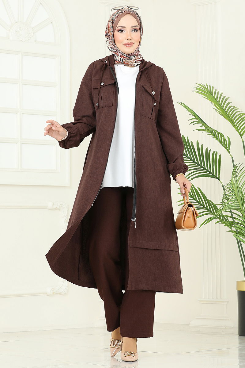 Product Feature : It is a new season hijab fashion product. The product has a Hooded collar. Unlined. The product has a zipper at the From the front part. The product has a pocket. The waist of the trousers is elastic. The cuff is rubberized. There may be a tonal difference in the product due to concept photo shoots.