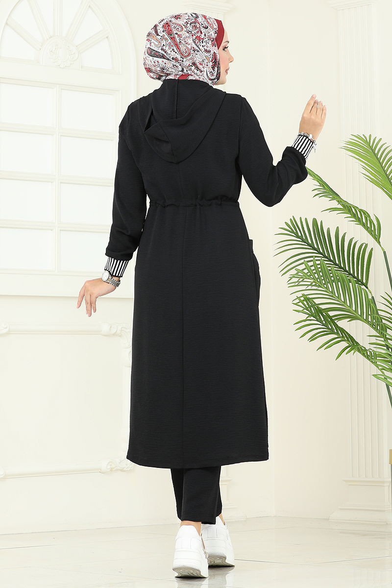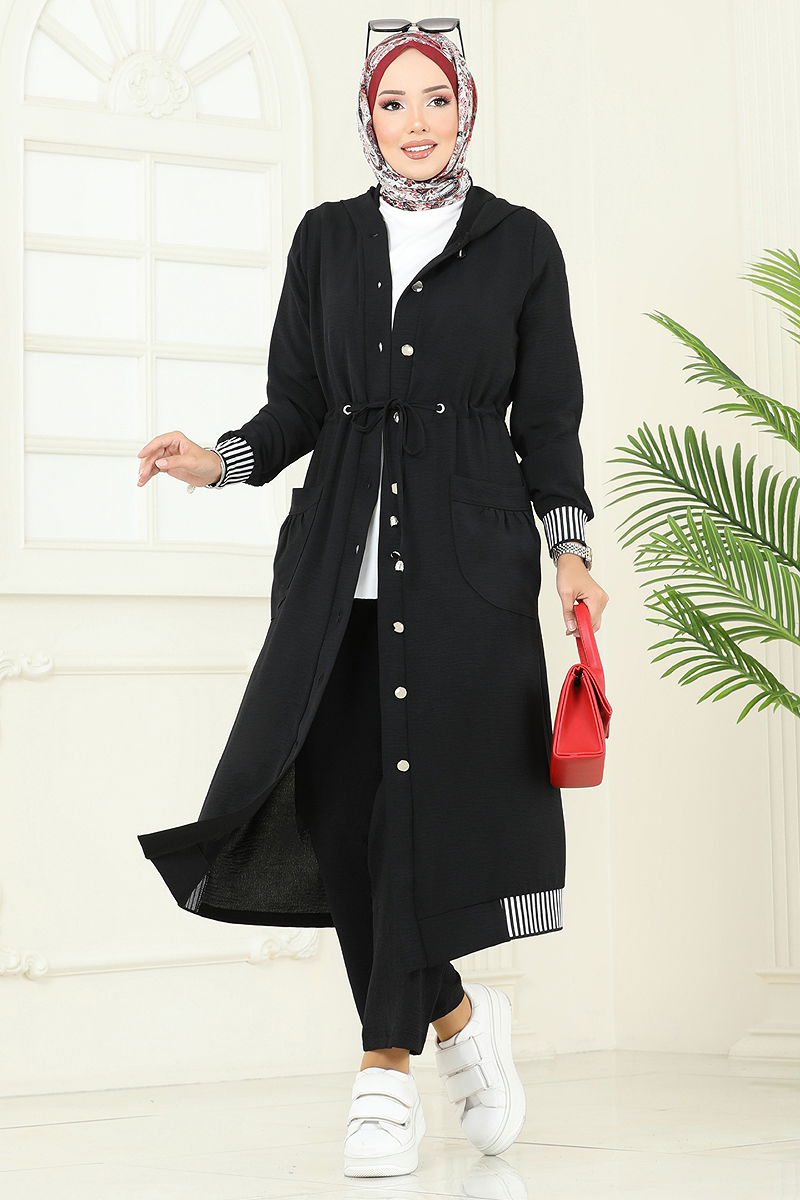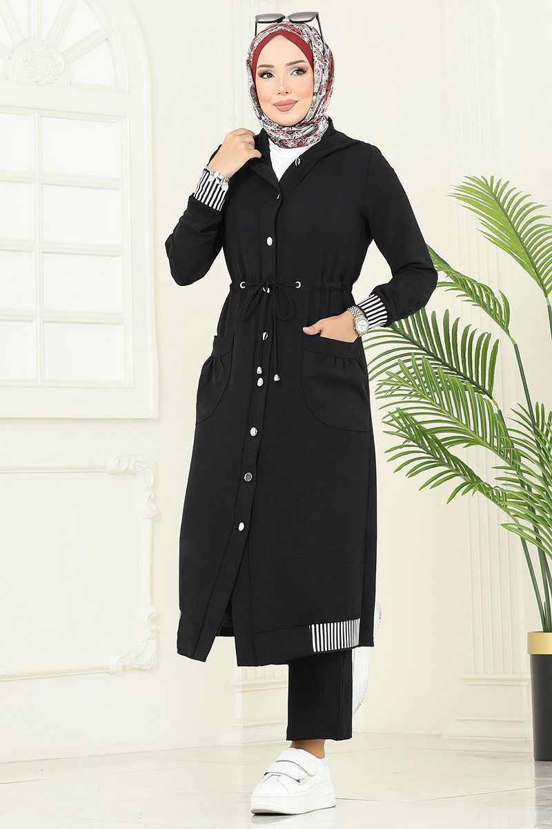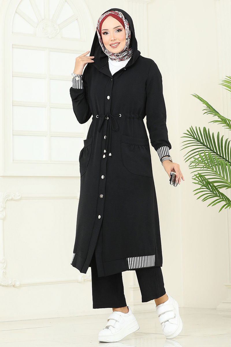 Product Feature : It is a new season hijab fashion product. It has a laced waist. The product has a Hooded collar. The product has From the front buttons. Unlined. Pocket available. The waist of the trousers is elastic. There may be a tonal difference in the product due to concept photo shoots.