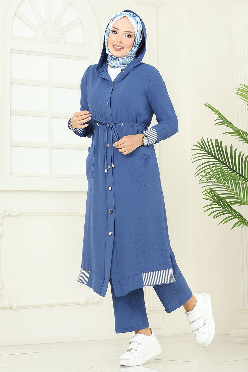 Product Feature : It is a new season hijab fashion product. It has a laced waist. The product has a Hooded collar. The product has From the front buttons. Unlined. Pocket available. The waist of the trousers is elastic. There may be a tonal difference in the product due to concept photo shoots.