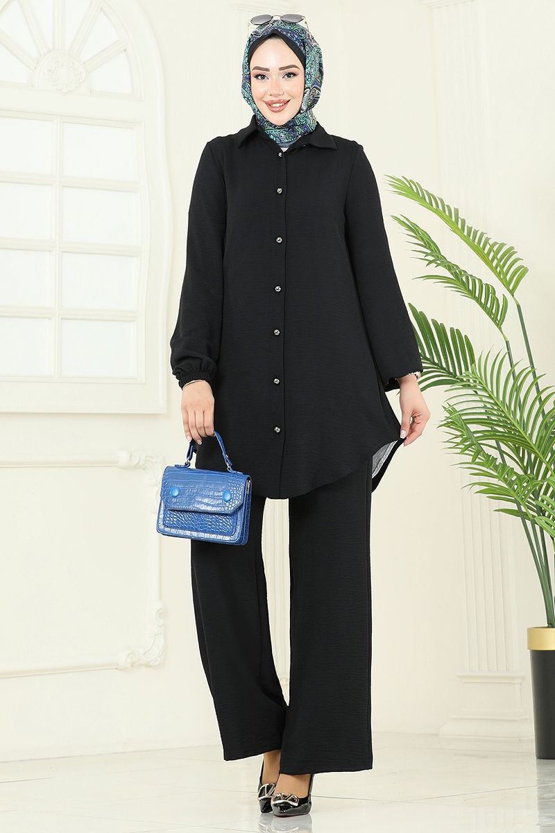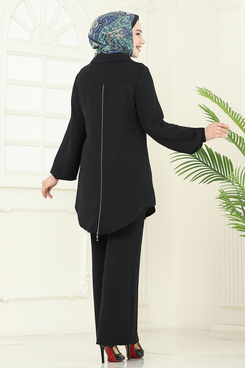 The Zip-Back Modest Suit offers a stylish and comfortable dressing experience, suitable for all seasons. This suit can be washed at 30 degrees with delicate care due to its durable aerobin fabric construction. Featuring a shirt collar and front button design, it combines classic and modern lines. Its back zipper and elastic waistband pants ensure a comfortable fit. Ideal for both everyday wear and special occasions, this modest suit will become an indispensable part of your wardrobe.