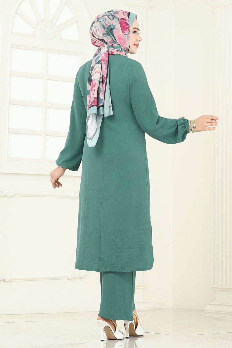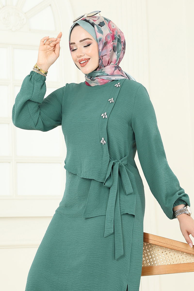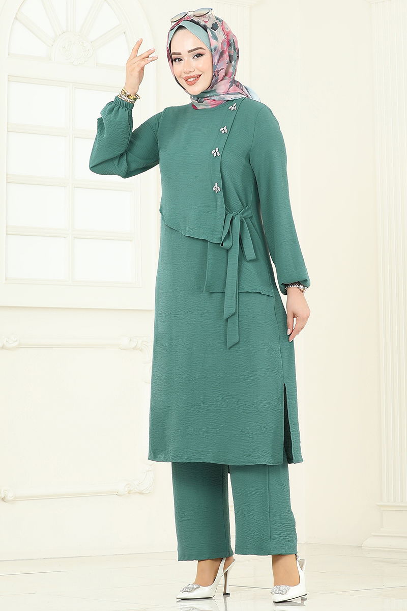 يحتوي على حزام يمكن تثبيته من الجانب. يوجد زر يمكن استخدامه من الخلف. المنتج لديه ياقة دائرية. البلوز تحتوي على فتحة. غير مبطنة. التفاصيل الحجرية محفورة. خصر البنطال مرن. السوار مطاطي. قد يكون هناك اختلاف في الدرجة اللونية في المنتج بسبب التقاط الصور الفوتوغرافية.