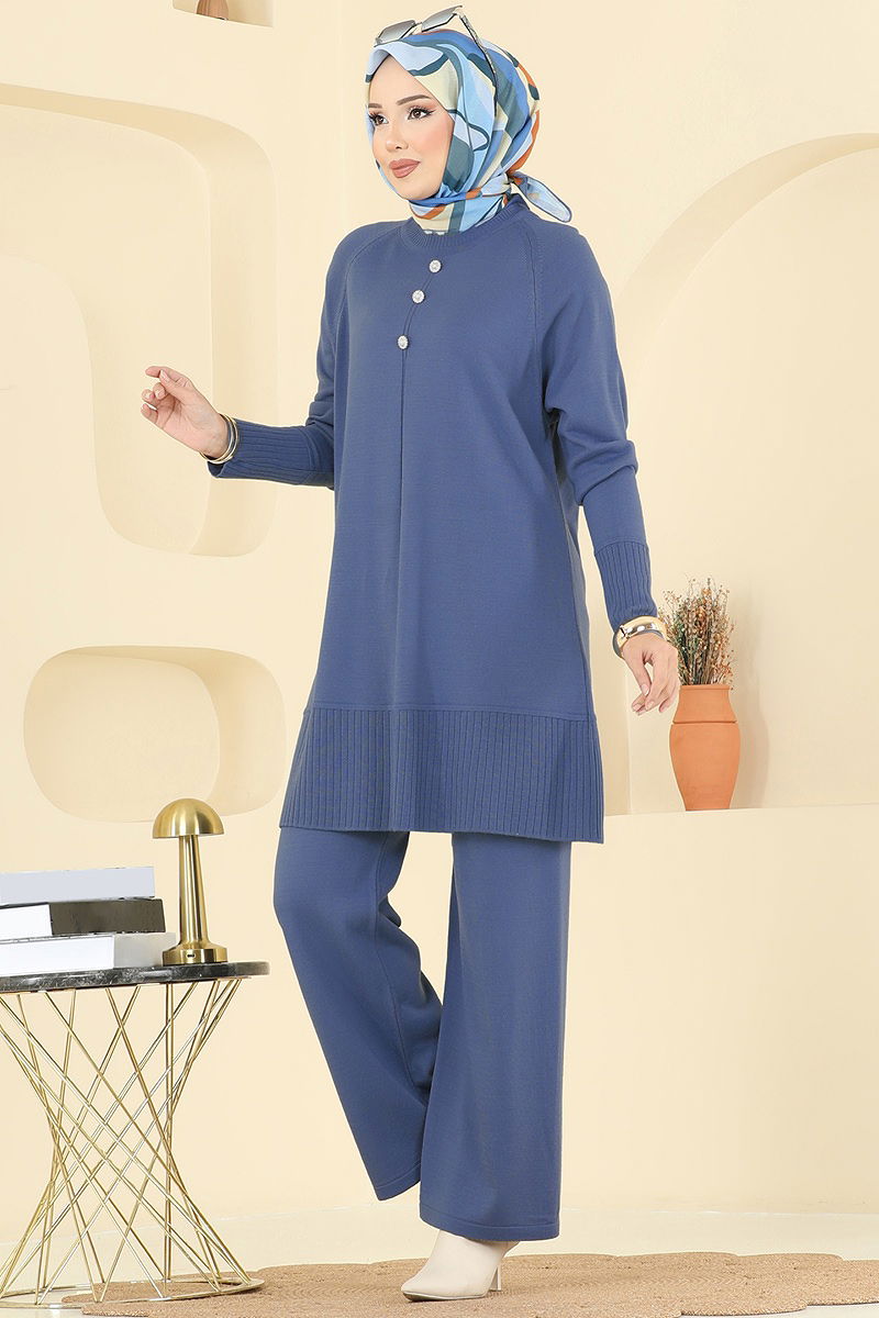 Smart and stylish, the Buttoned Knitwear Set with Accessories is designed to warm your autumn and winter. Offering ease of washing at 30 degrees with a delicate wash feature, this hijab-friendly product combines comfort and elegance. Made from knit fabric, the set consists of a bicycle neck tunic and an elastic waist pants. Complete your style with buttons added as accessories.