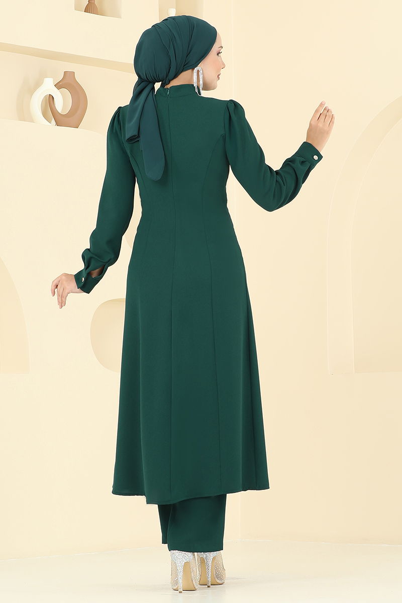 المنتج لديه ياقة نصف بيضوية. يحتوي على فتحة. غير مبطنة. المنتج به سحاب في جزء من الخلف. يتم لصق الحجارة. خصر البنطال مرن. أزرار الكفة نشطة. قد يكون هناك اختلاف في الدرجة اللونية في المنتج بسبب التقاط الصور الفوتوغرافية.
