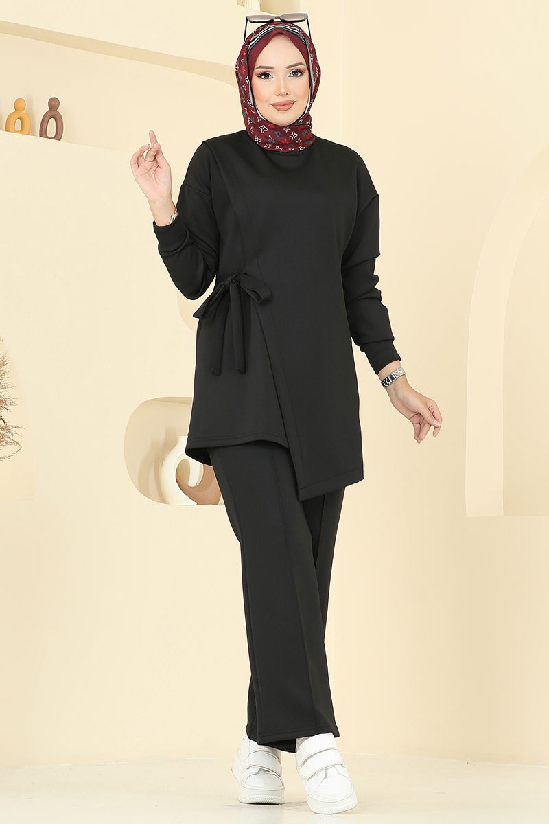 The Scuba Takım KOMBİN with side tie detail and crew neck is an ideal choice for modest clothing. Suitable for all seasons, this suit can be washed at 30 degrees with gentle care. Made from scuba fabric, it features an adjustable belt on the side. It offers both comfort and elegance with a tunic and pants with a semi-elastic waist. The product on the model is size 38.