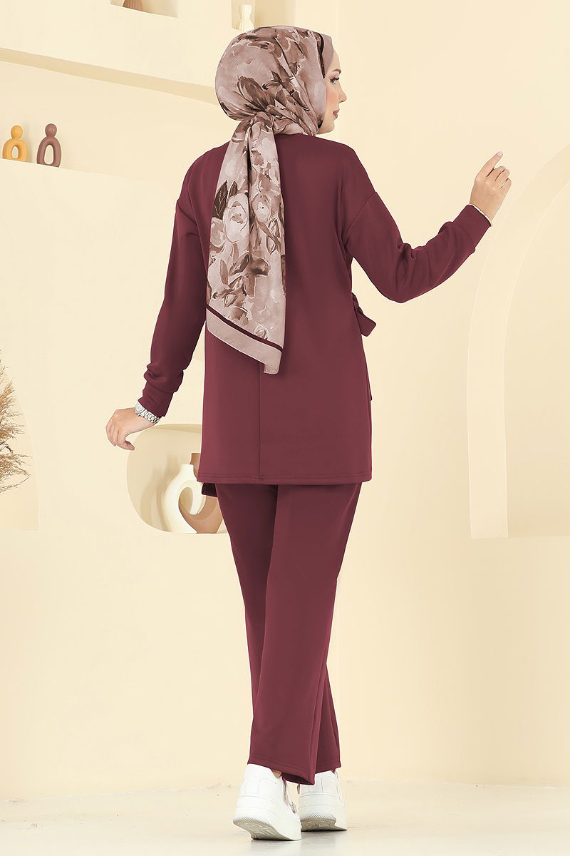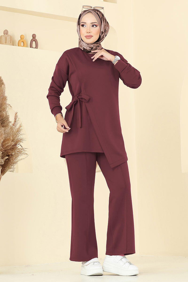 The Scuba Takım KOMBİN with side tie detail and crew neck is an ideal choice for modest clothing. Suitable for all seasons, this suit can be washed at 30 degrees with gentle care. Made from scuba fabric, it features an adjustable belt on the side. It offers both comfort and elegance with a tunic and pants with a semi-elastic waist. The product on the model is size 38.