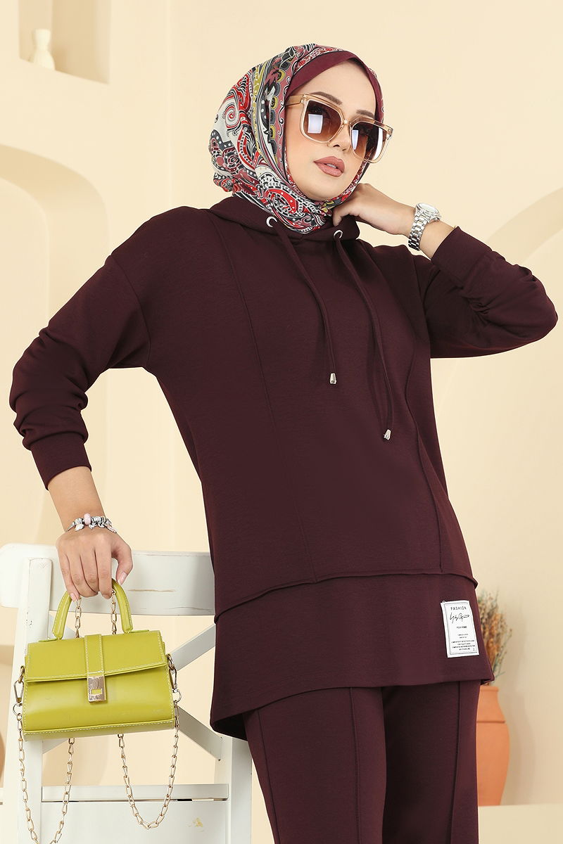 The Hooded Detail Modal Suit COMBINE is a modest wear suitable for all seasons. Made from modal fabric, it features a hooded neckline and is unlined. The model displayed wears a size 38. It requires gentle washing at up to 30 degrees Celsius. The trousers have an elastic waist, ensuring comfort in both the tunic and trousers.
