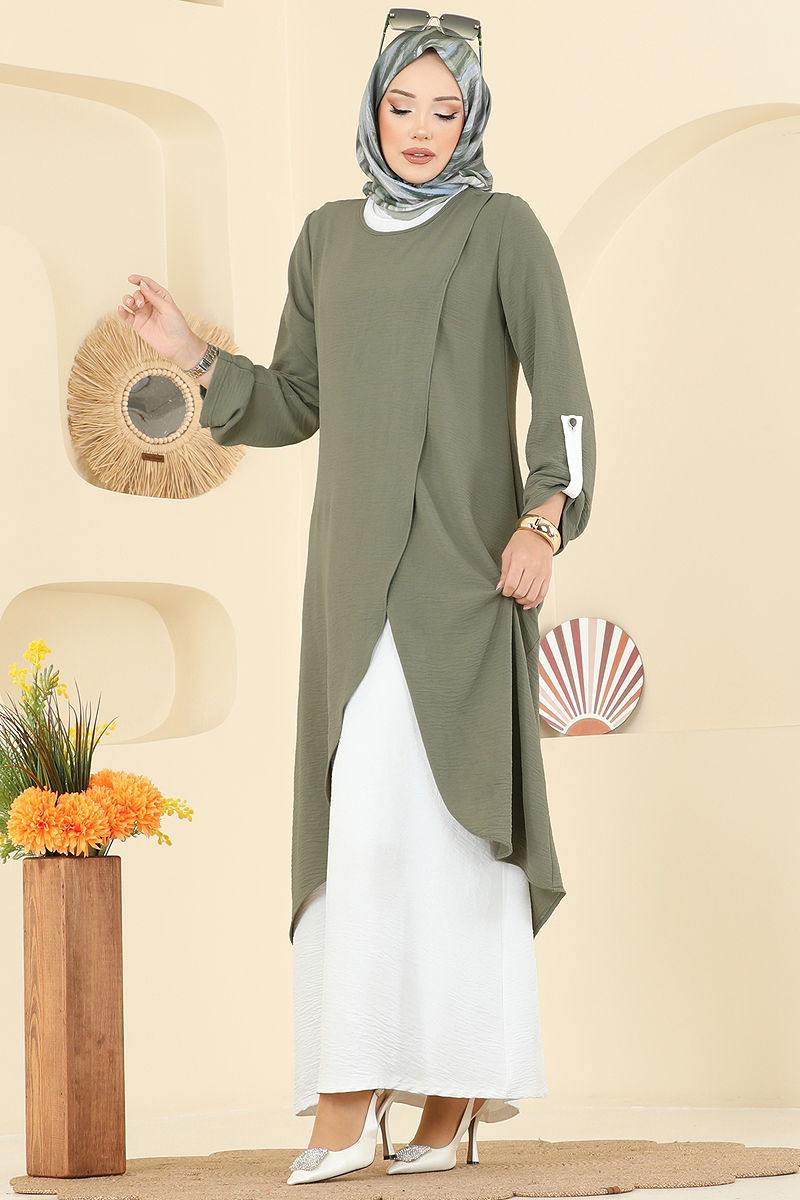 يتم ارتداء المنتج على الرأس. المنتج لديه ياقة دائرية. البلوز تحتوي على فتحة. غير مبطنة. الفستان الداخلب بلا اكمام .أزرار الكتّافات على الأكمام قابلة للاستخدام قد يكون هناك اختلاف في الدرجة اللونية في المنتج بسبب التقاط الصور الفوتوغرافية.