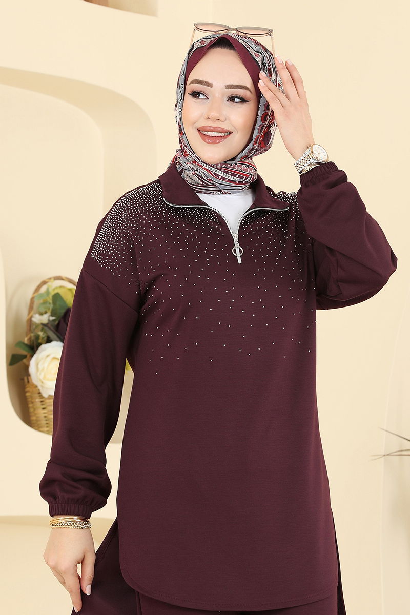 Product Feature : It is a new season hijab fashion product. There is a half zipper that can be used from the front. The product has a Upright collar. Unlined. The stones are glued. The waist of the trousers is elastic. The cuff is rubberized. There may be a tonal difference in the product due to concept photo shoots.