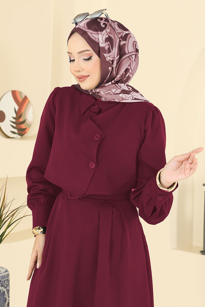 Product Feature : It is a new season hijab fashion product. Bolero detail is sewn onto the product. The product has a Shirt collar. There is no belt bridge on the product. Buttons are active. Belt included, optional not available. The skirt has a back zipper at the waist. Cuff buttons are active. There may be a tonal difference in the product due to concept photo shoots.