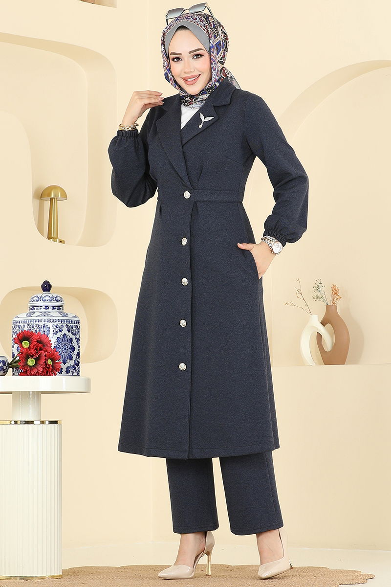 Product Feature : It is a new season hijab fashion product. There is a hidden pocket in the product. The product has a Double-breasted collar. The product has From the front buttons. Unlined. Belt is sewn to the product. The waist of the trousers is elastic. The cuff is rubberized. There may be a tonal difference in the product due to concept photo shoots.