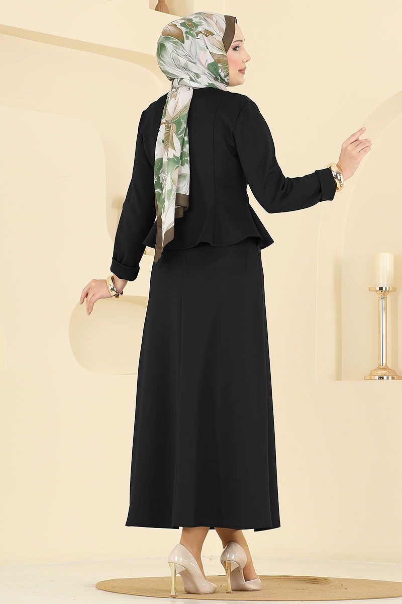 The Gold Snap Button Elegant Suit is a modest wear product that combines elegance and comfort. Suitable for all seasons, this suit can be washed carefully at 30 degrees. Made from scuba diver fabric, this outfit features a mandarin collar design and active snap details. The skirt is zippered and the suit is unlined. With its chic and modern design, the Gold Snap Button Elegant Suit will become an indispensable part of your wardrobe.