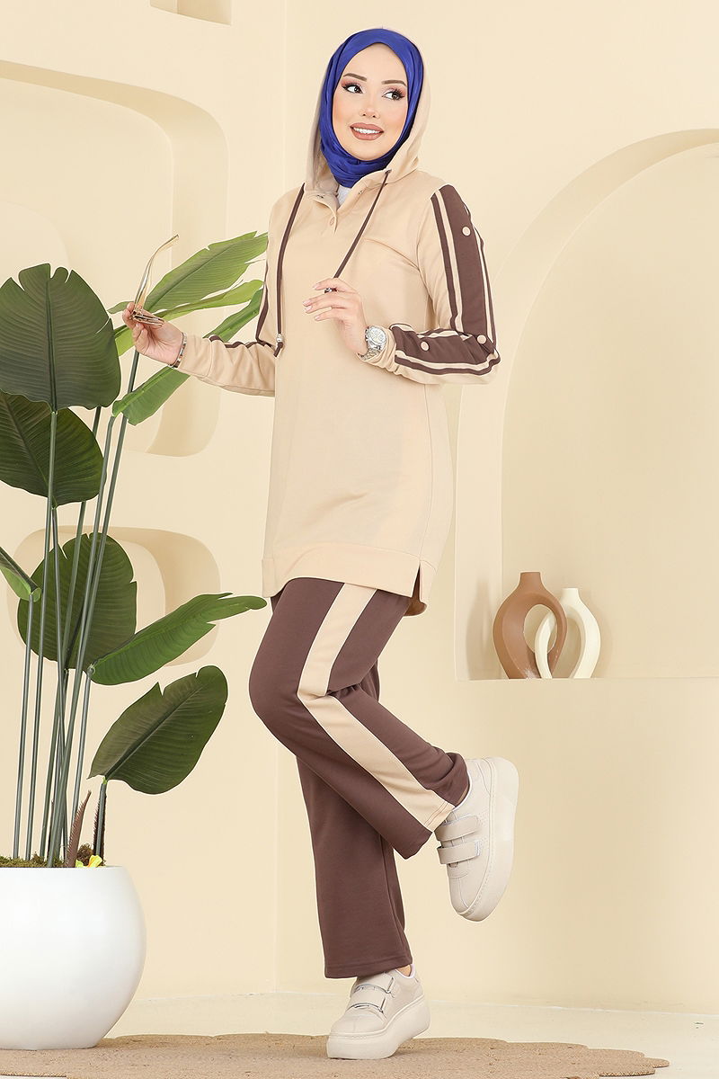 Embrace the new season with the Stripe Detail Two-String Set , bringing elegance and comfort together in modest wear. Suitable for all seasons, this garment can be washed at 30 degrees on a gentle cycle and is made from durable two-thread fabric. The design features a hooded neckline with an active drawstring, adding a modern touch. Snap details enhance its elegance while the elastic waistband trousers increase comfort. This complete set includes both a tunic and trousers. The product shown on the model is size 38.