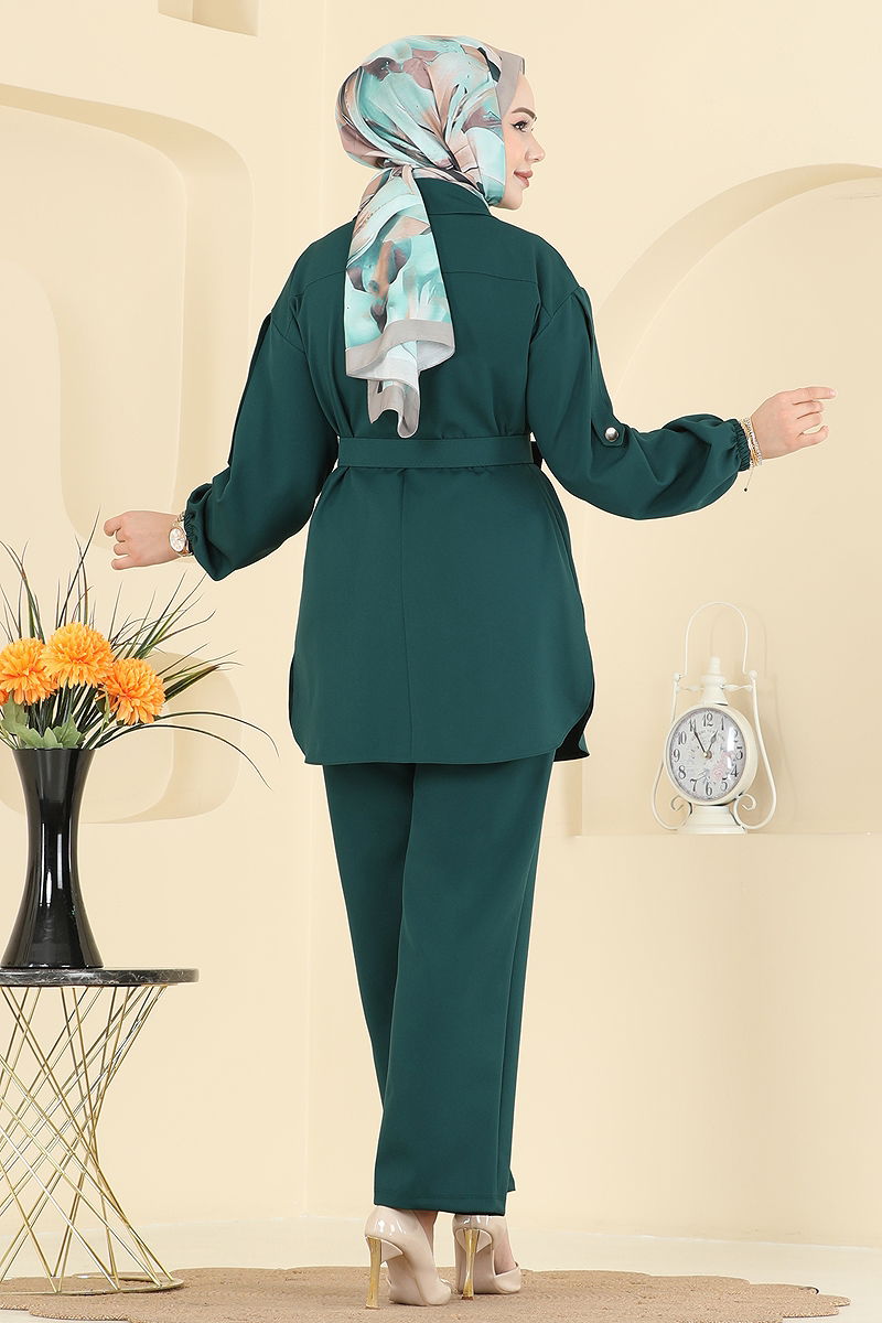 Product Feature : It is a new season hijab fashion product. The product has a Shirt collar. The product has From the front buttons. There is no belt bridge on the product. Epaulette buttons are accessories Belt included, optional not available. There is a pocket on the tunic. The waist of the trousers is elastic. The cuff is rubberized. There may be a tonal difference in the product due to concept photo shoots.