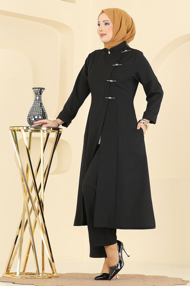 Showcasing unique design and high-quality fabric, the Button-Detailed Dabıl Suit KOMBIN offers elegance and comfort together in modest wear. This product, which can be washed gently at 30 degrees, has a lined stand-up collar. Comprising a tunic and trousers, the ensemble includes practical pockets on the tunic. The elastic waistband on the trousers ensures comfort all day long. Ideal for those who embrace a distinctive design philosophy, it features both front and concealed buttons.