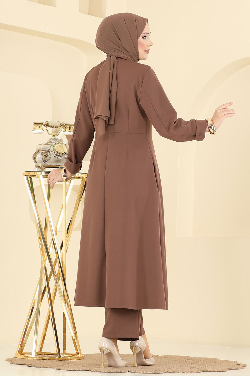 Showcasing unique design and high-quality fabric, the Button-Detailed Dabıl Suit KOMBIN offers elegance and comfort together in modest wear. This product, which can be washed gently at 30 degrees, has a lined stand-up collar. Comprising a tunic and trousers, the ensemble includes practical pockets on the tunic. The elastic waistband on the trousers ensures comfort all day long. Ideal for those who embrace a distinctive design philosophy, it features both front and concealed buttons.