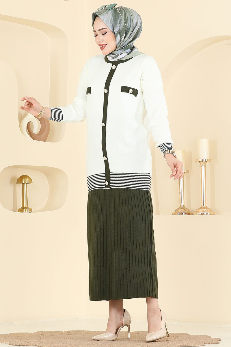 The Accessory Buttoned Skirt Set COMBINE introduces a fresh perspective to modest fashion with its smart and elegant design. Suitable for Autumn and Winter, this set is gentle wash compatible at 30 degrees. Made from soft knit fabric, it features a semi-mandarin collar and is unlined for comfort. Decorative buttons and an elastic waistband on the skirt enhance both style and functionality. Perfectly fitting standard sizes (38, 40, 42), it will become an essential item in your wardrobe.