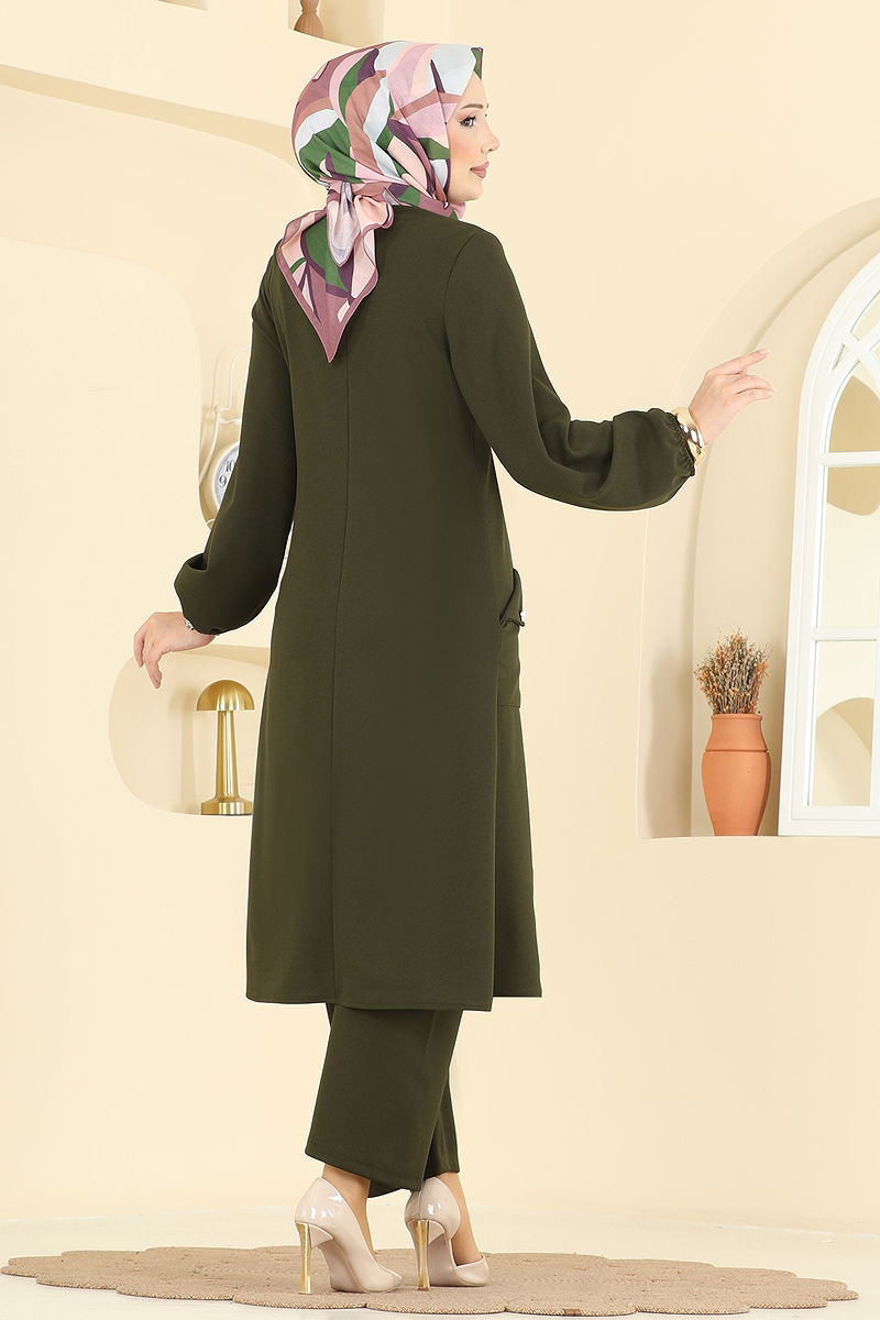 يوجد زر يمكن استخدامه من الخلف. المنتج لديه ياقة دائرية. غير مبطنة. الأزرار هي إكسسوارات. الجيب متاح. خصر البنطال مرن. السوار مطاطي. قد يكون هناك اختلاف في الدرجة اللونية في المنتج بسبب التقاط الصور الفوتوغرافية.