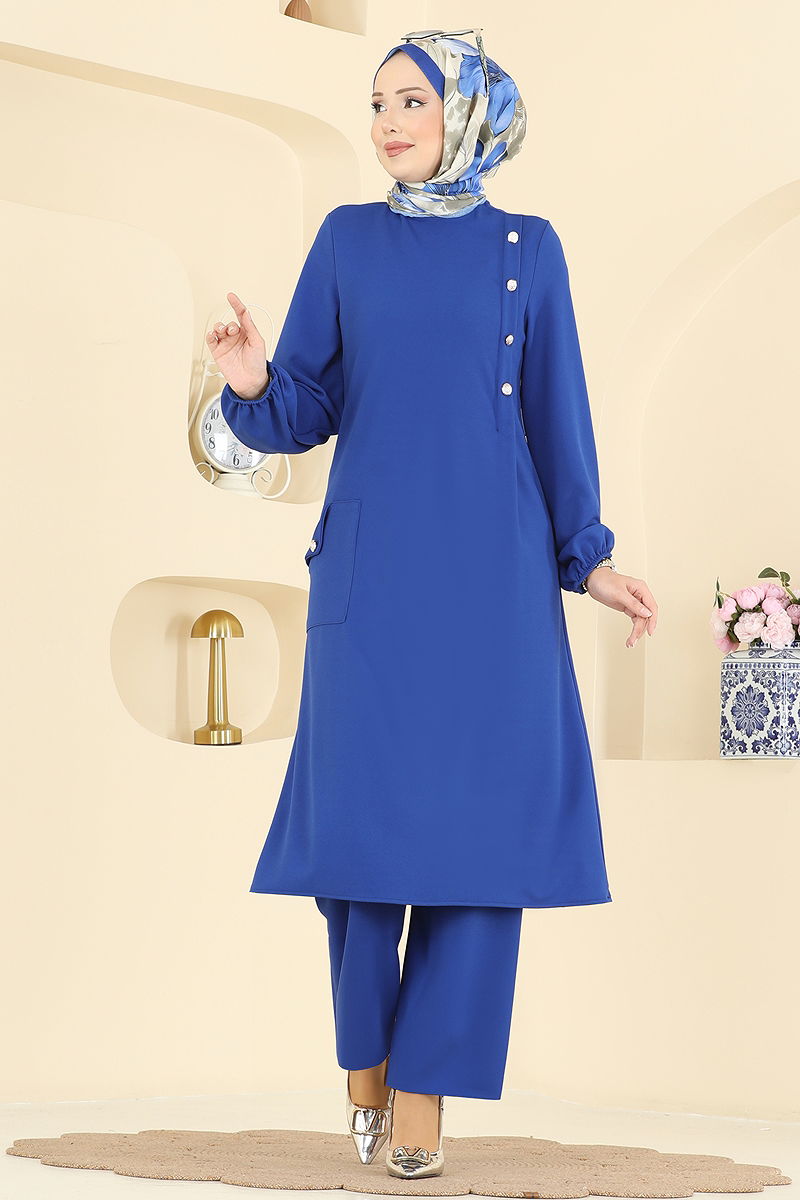 If you are looking for a chic and modern style, the Single Pocket Crepe Suit COMBINATION is perfect for you! Suitable for all seasons, this modest wear suit offers gentle wash at 30 degrees. Its crew neck and unlined design prioritize comfort, while the back-button feature and elastic waistband on the pants ensure all-day ease. Pockets in the tunic and pants increase functionality, while the elastic details on the cuffs complete the elegance. The product on the model is size 38.