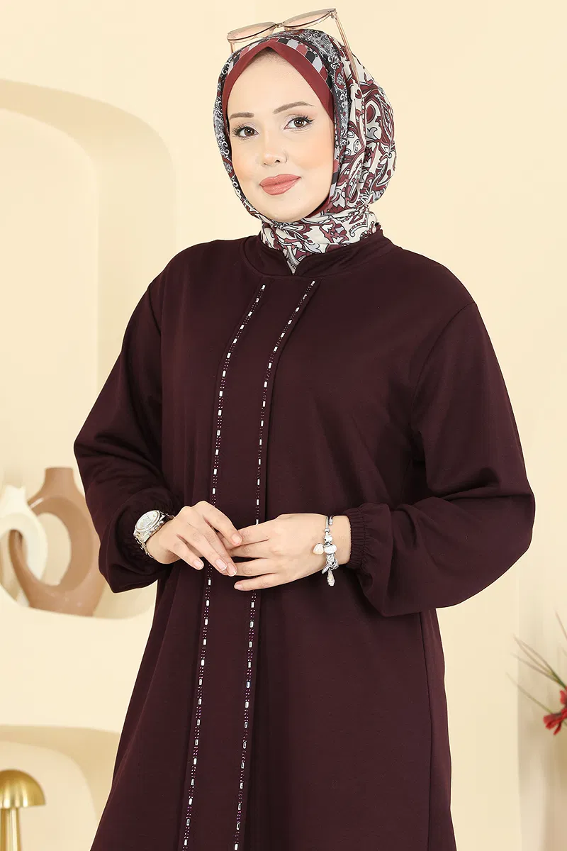 Ideal for those seeking stylish and comfortable attire, the Stripe Detailed Modal Set can be comfortably worn in all seasons. Thanks to the soft texture and breathability of modal fabric, you can remain comfortable throughout the day. This set, which can be washed at 30 degrees on a gentle cycle, combines comfort with aesthetics through its semi-mandarin collar design and lining-free structure. The tunic embellished with elegant stone details and trousers with elastic cuffs are standout pieces in modern modest fashion.