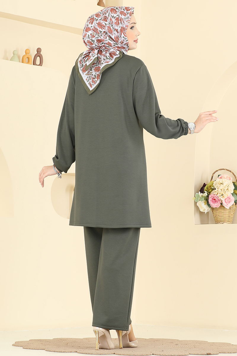 Ideal for those seeking stylish and comfortable attire, the Stripe Detailed Modal Set can be comfortably worn in all seasons. Thanks to the soft texture and breathability of modal fabric, you can remain comfortable throughout the day. This set, which can be washed at 30 degrees on a gentle cycle, combines comfort with aesthetics through its semi-mandarin collar design and lining-free structure. The tunic embellished with elegant stone details and trousers with elastic cuffs are standout pieces in modern modest fashion.