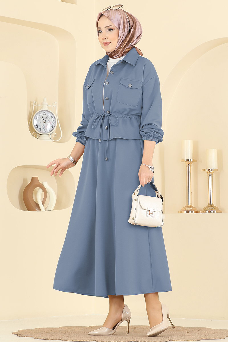 Our Beli Tunnel Waist Skirt Suit model is a modest wear product that can be comfortably worn in all seasons. Washable at 30 degrees on a gentle cycle, this elegant item offers practical use with its shirt collar design and front button closure. The unlined fabric provides a light and comfortable experience, while the drawstring waist design and elastic skirt waist offer perfect fit and comfort for both everyday wear and special occasions. Designed to fit all sizes with a sample size of 38 on the model, it also features an active chest pocket and elastic cuffs on the blouse, adding a modern touch to the design.