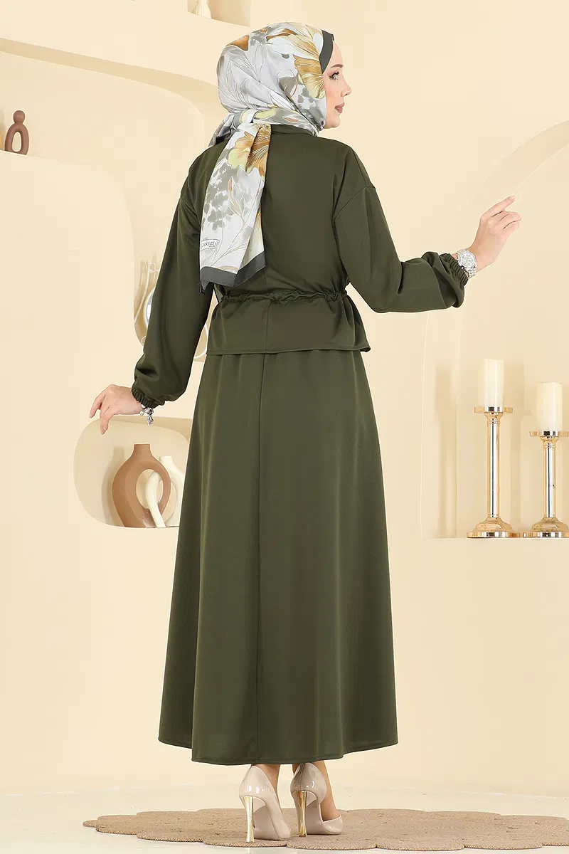 Our Beli Tunnel Waist Skirt Suit model is a modest wear product that can be comfortably worn in all seasons. Washable at 30 degrees on a gentle cycle, this elegant item offers practical use with its shirt collar design and front button closure. The unlined fabric provides a light and comfortable experience, while the drawstring waist design and elastic skirt waist offer perfect fit and comfort for both everyday wear and special occasions. Designed to fit all sizes with a sample size of 38 on the model, it also features an active chest pocket and elastic cuffs on the blouse, adding a modern touch to the design.