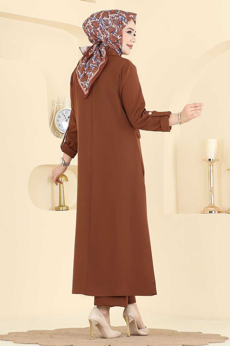 The Accessory Pocket Dabıl Suit KOMBIN is a hijab outfit suitable for all seasons. It can be washed at 30 degrees with delicate care. Made from durable and stylish Dabıl fabric, this suit features a shirt collar design and is unlined, with the displayed model wearing size 40. It offers practical use with its front usable buttons and hidden buttons. The waist of the outfit is stitched, and the pants have an elastic waistband, ensuring comfortable wear. The pocket detail on the tunic and pants enhances your elegance, while the active buttons on the cuffs add a finishing touch.