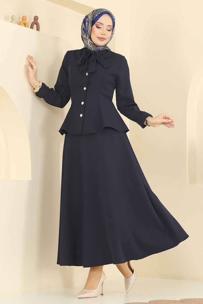 The Collared Dabıl Suit COMBO is a stylish and modern modest wear product that stands out with its design. Suitable for all seasons, this combo is made from special Dabıl fabric which ensures durability. The product can be washed at 30 degrees on a gentle cycle and offers practicality with its design features. With a semi-Mao collar and front button closure, this combo is light and comfortable due to its unlined structure. The set includes a blouse and a skirt with a zippered waist, and the lace details enhance the elegance.