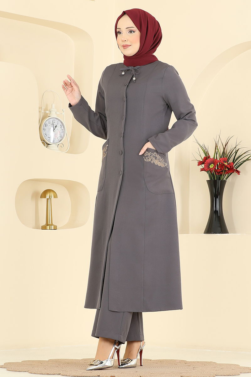 The Embroidered Pocket Duo Set is a specially designed modest wear suitable for all seasons. It is recommended to be washed at 30 degrees due to its delicate nature. Made from durable Dabıl fabric, it features an elegant standing collar and front button details. The unlined design and elastic waistband on the trousers ensure comfort, while practical pockets on the tunic and trousers make it ideal for daily use. The embroidered details on the displayed size 38 product add an aesthetic touch.
