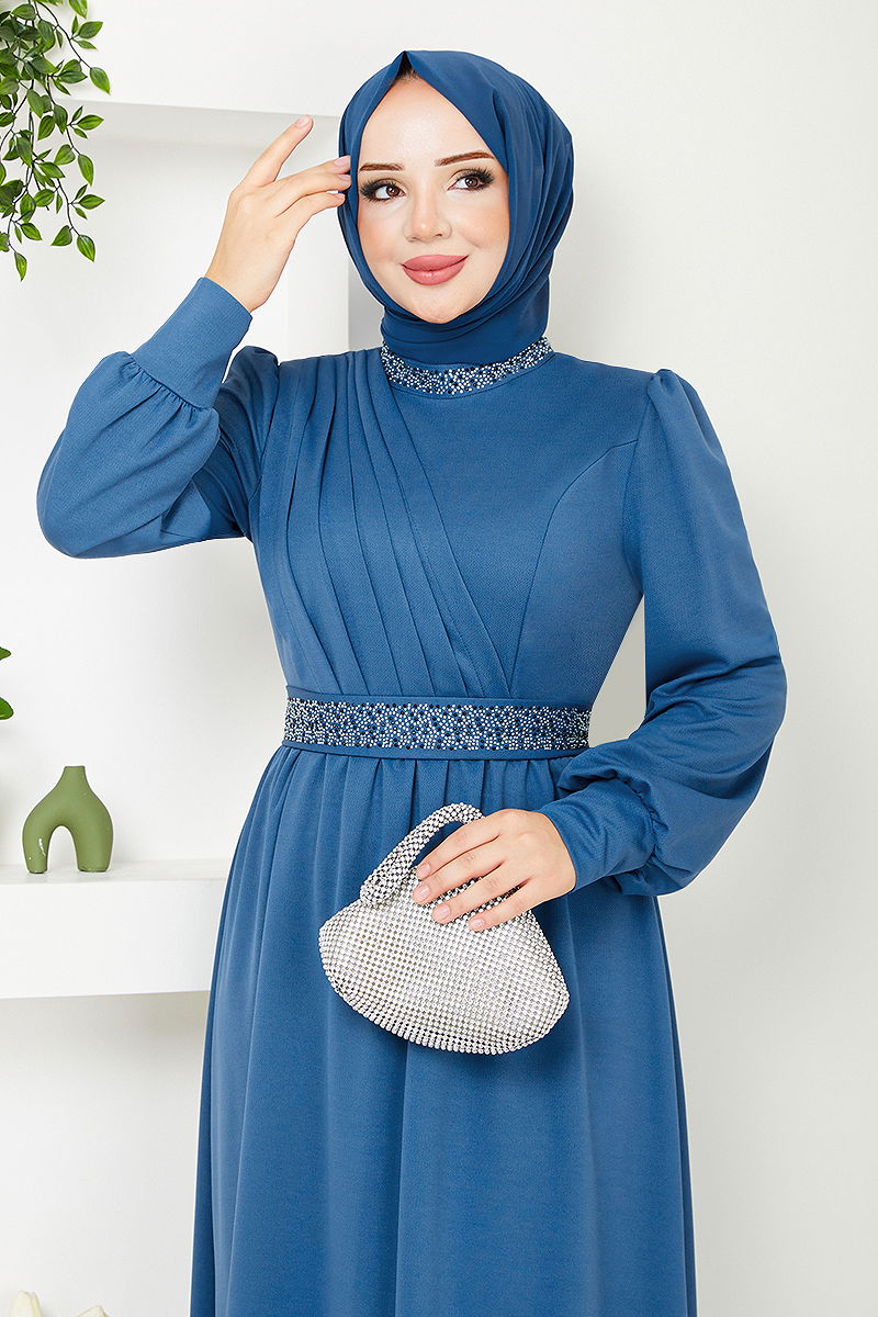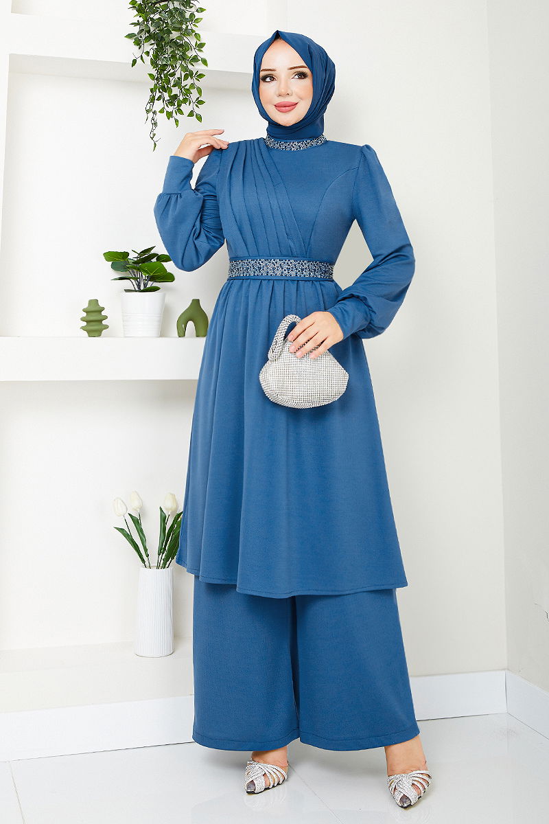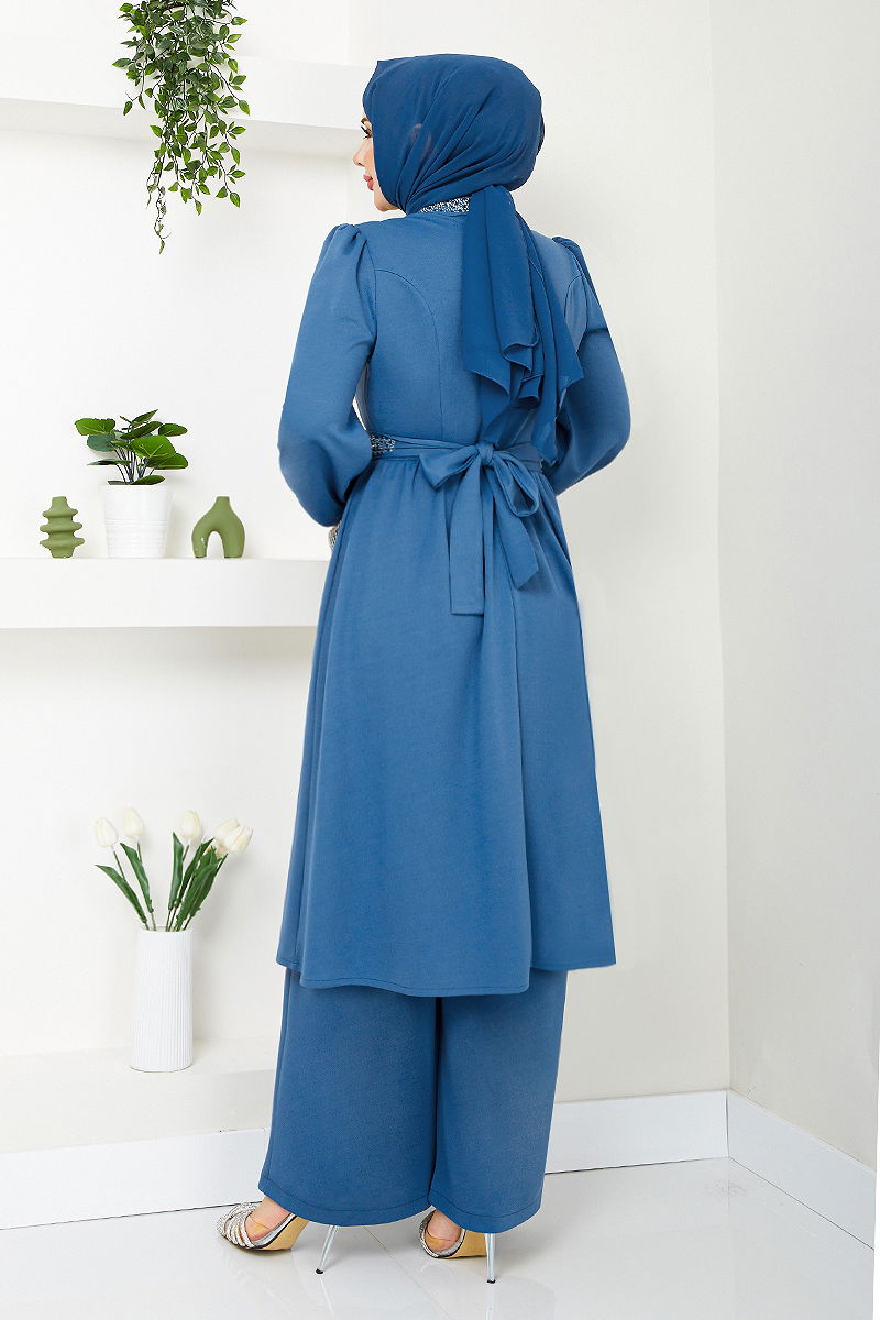 المنتج لديه ياقة نصف بيضوية. غير مبطنة.. المنتج به سحاب في جزء من الخلف. يتم لصق الحجارة. الحزام متضمن، ،يمكن استخدامها حسب الرغبة يتميز البنطال بخصر نصف مطاطي. قد يكون هناك اختلاف في الدرجة اللونية في المنتج بسبب التقاط الصور الفوتوغرافية.