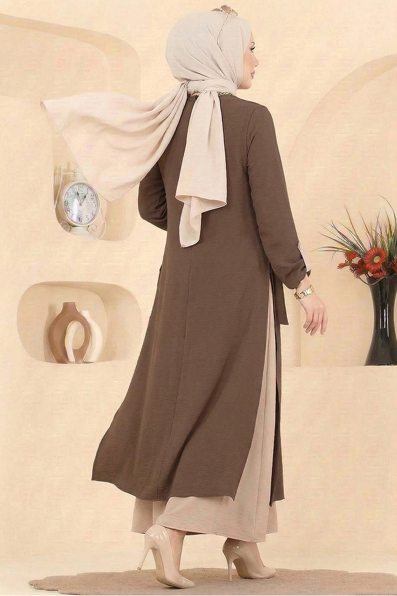 The Skirted Aerobin Two-Piece Set, perfect for Spring and Summer, combines elegance and comfort in modest fashion. Made from aerobin fabric, this exclusive design stands out with its lightweight and breathable structure. The bicycle neck tunic offers freedom of movement with side slit details, while the elastic waistband on the skirt and adjustable side drawstrings ensure a perfect fit. Easily cleaned with delicate washing, this unlined set keeps you cool during the summer months. Chic cuff epaulette buttons add an elegant touch to your ensemble.