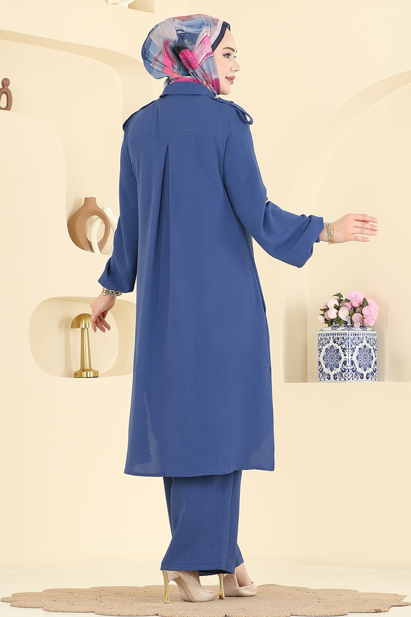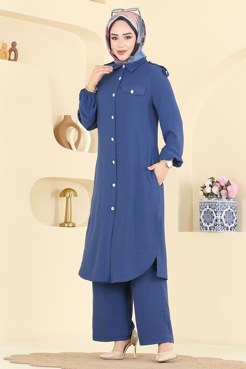 Product Feature : It is a new season hijab fashion product. The product has a Shirt collar. The product has From the front buttons. The tunic has a side slash.. Unlined. Pocket detail is an accessory. The waist of the trousers is elastic. The cuff is rubberized. There may be a tonal difference in the product due to concept photo shoots.
