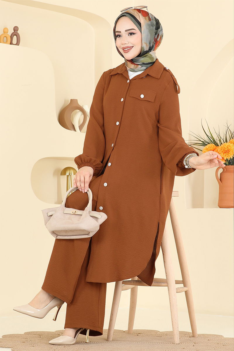 Product Feature : It is a new season hijab fashion product. The product has a Shirt collar. The product has From the front buttons. The tunic has a side slash.. Unlined. Pocket detail is an accessory. The waist of the trousers is elastic. The cuff is rubberized. There may be a tonal difference in the product due to concept photo shoots.