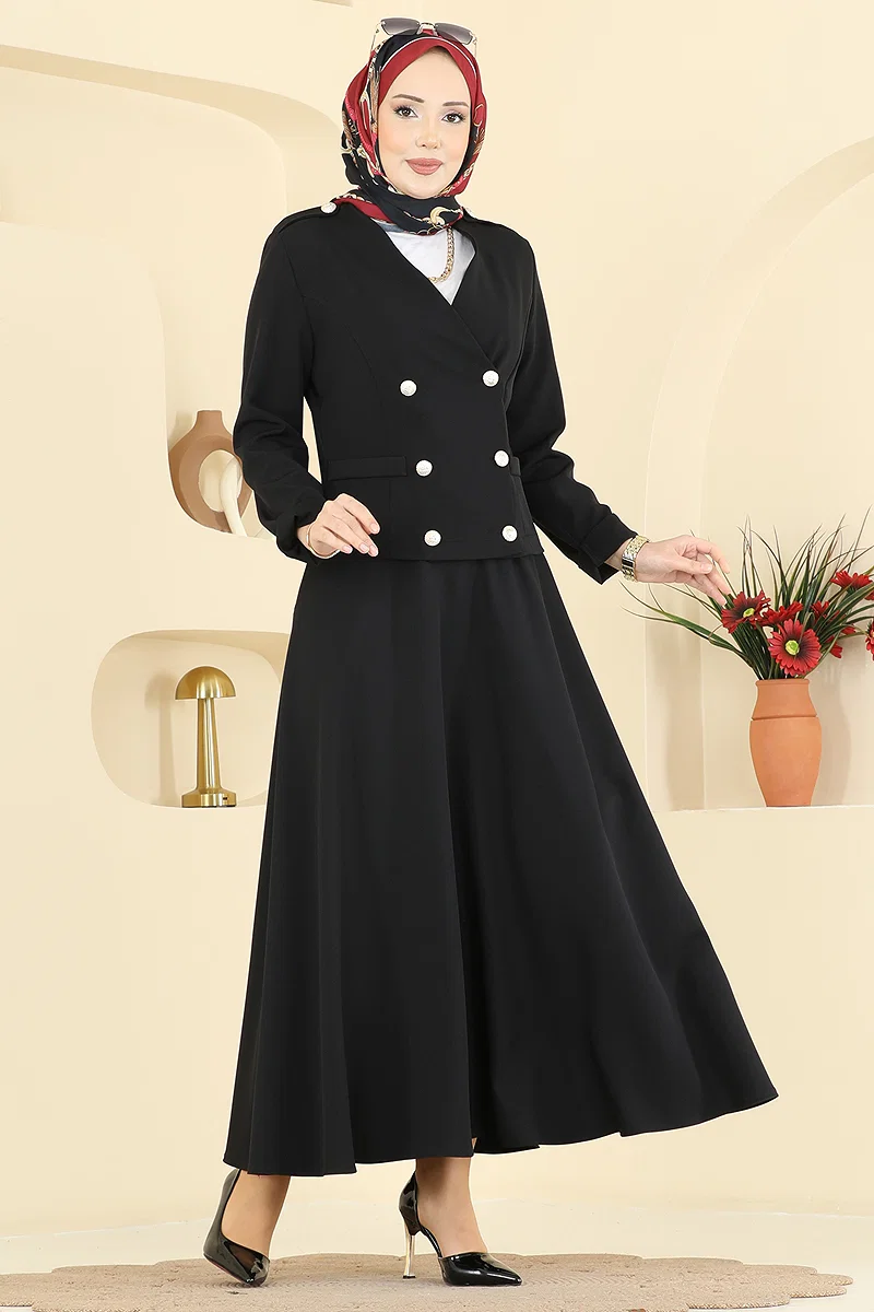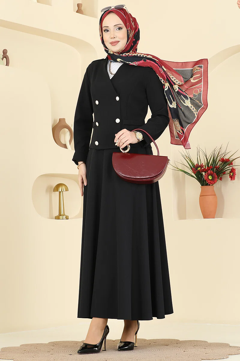 Product Feature : It is a new season hijab fashion product. There are buttons available from the front. The product has a V Neck collar. The product has From the front buttons. Unlined. Accessory details are sewn on the product. Epaulette buttons are accessories Buttons are active. There is shoulder padding. The skirt has a back zipper at the waist. There may be a tonal difference in the product due to concept photo shoots.
