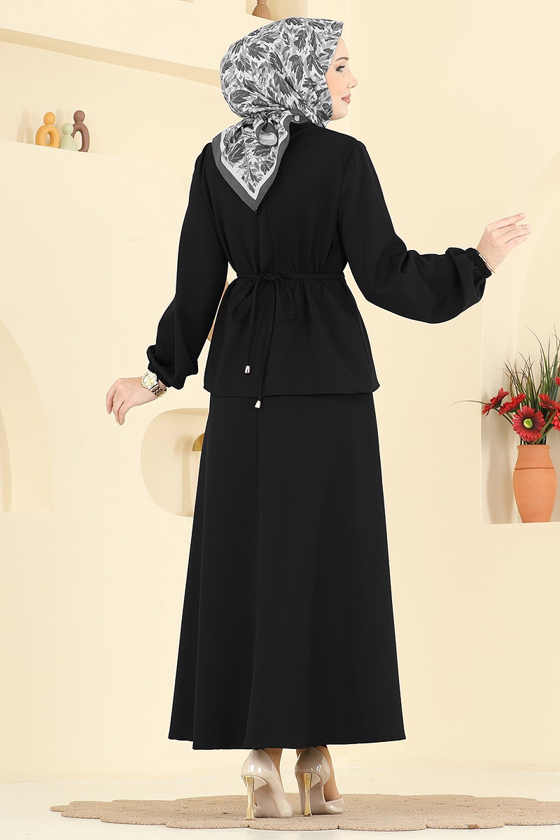 This stylish and functional 2-piece skirt set is a perfect addition to modern modest wear. Suitable for all seasons, it will become a staple in wardrobes. Made from Dabil fabric, this set can be cleaned at 30 degrees with gentle wash. The outfit features a stand-up collar and decorative yet functional buttons on the front. Both the skirt and tunic have an elastic waistband, providing optimum fit and comfort. The drawstring detail can be adjusted to suit your style.