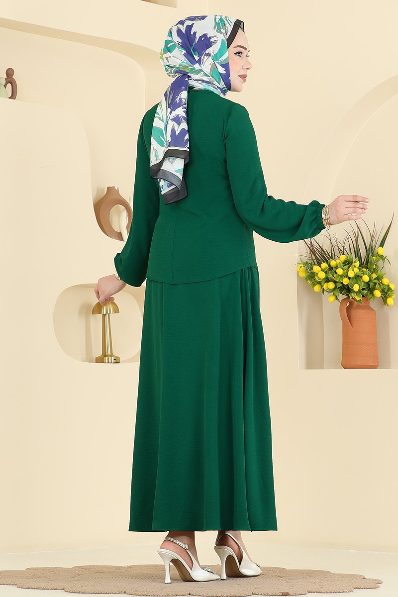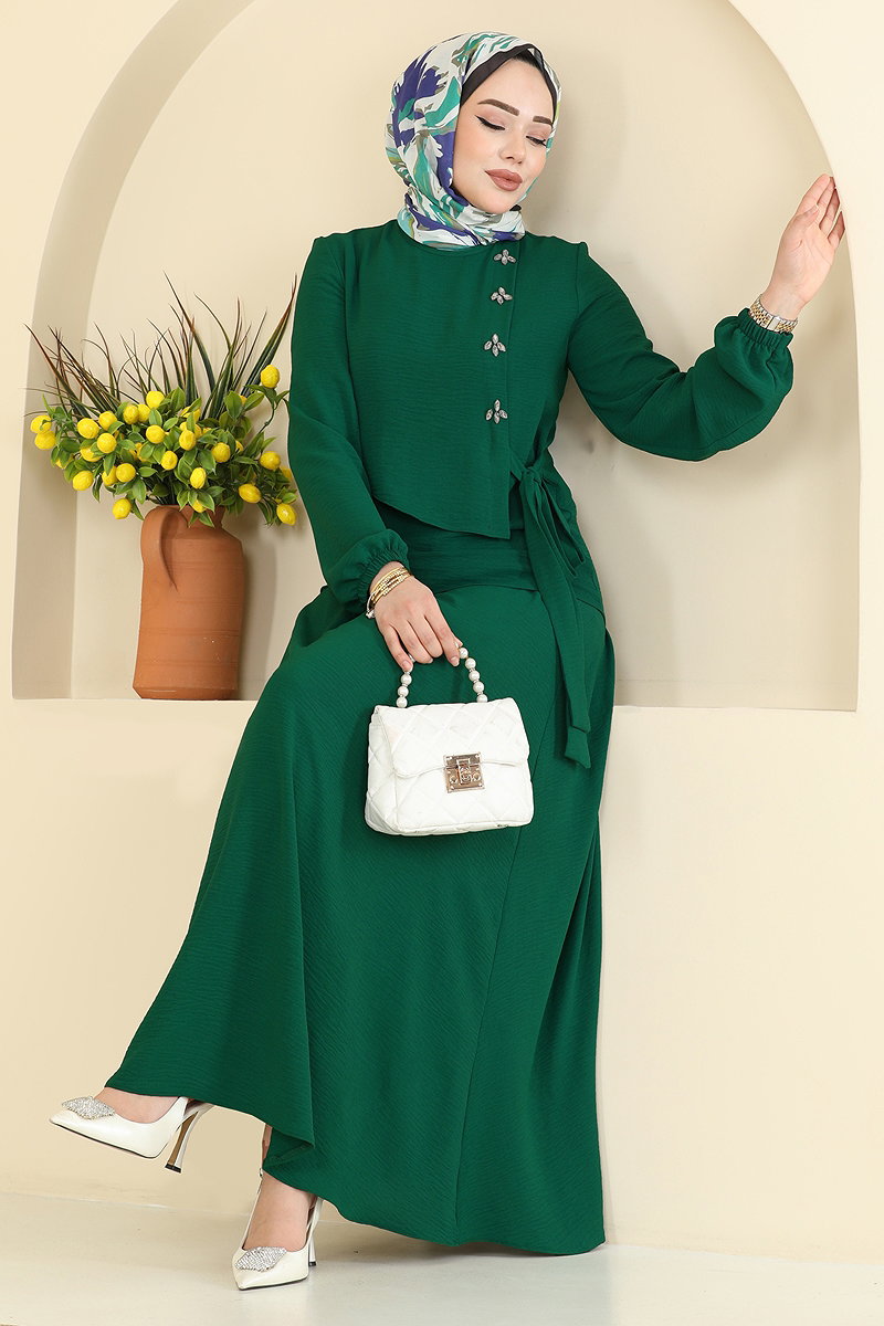 The Stone Detailed Skirt Set COMBINATION is an elegant and comfortable hijab-friendly attire suitable for all seasons. Recommended for delicate wash, this product can be washed at 30 degrees and is made from aerobin fabric. It features a bicycle neckline, adjustable drawstrings on the side, and a button at the back, making it stylish and functional. The stone detailing adds exquisite grace, while the elastic waistband and cuffs on the skirt increase comfort. Its chic, functional design makes this set perfect for everything from special occasions to everyday wear.