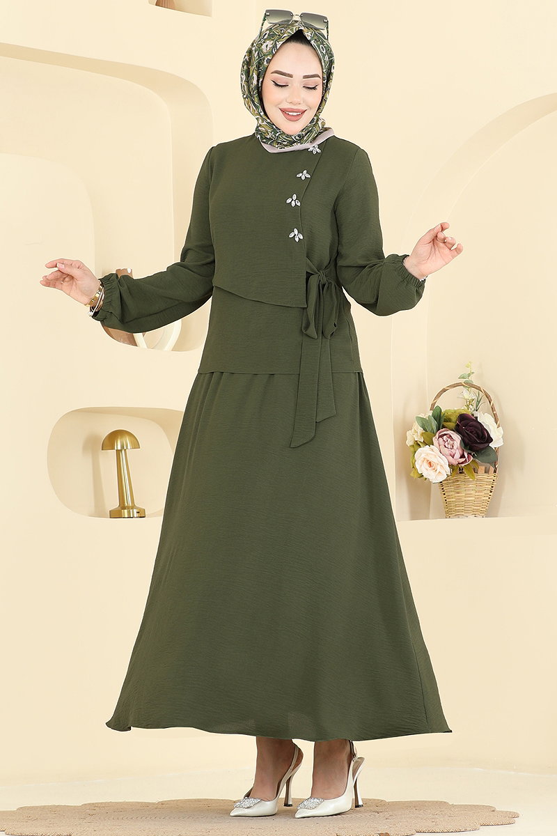 The Stone Detailed Skirt Set COMBINATION is an elegant and comfortable hijab-friendly attire suitable for all seasons. Recommended for delicate wash, this product can be washed at 30 degrees and is made from aerobin fabric. It features a bicycle neckline, adjustable drawstrings on the side, and a button at the back, making it stylish and functional. The stone detailing adds exquisite grace, while the elastic waistband and cuffs on the skirt increase comfort. Its chic, functional design makes this set perfect for everything from special occasions to everyday wear.