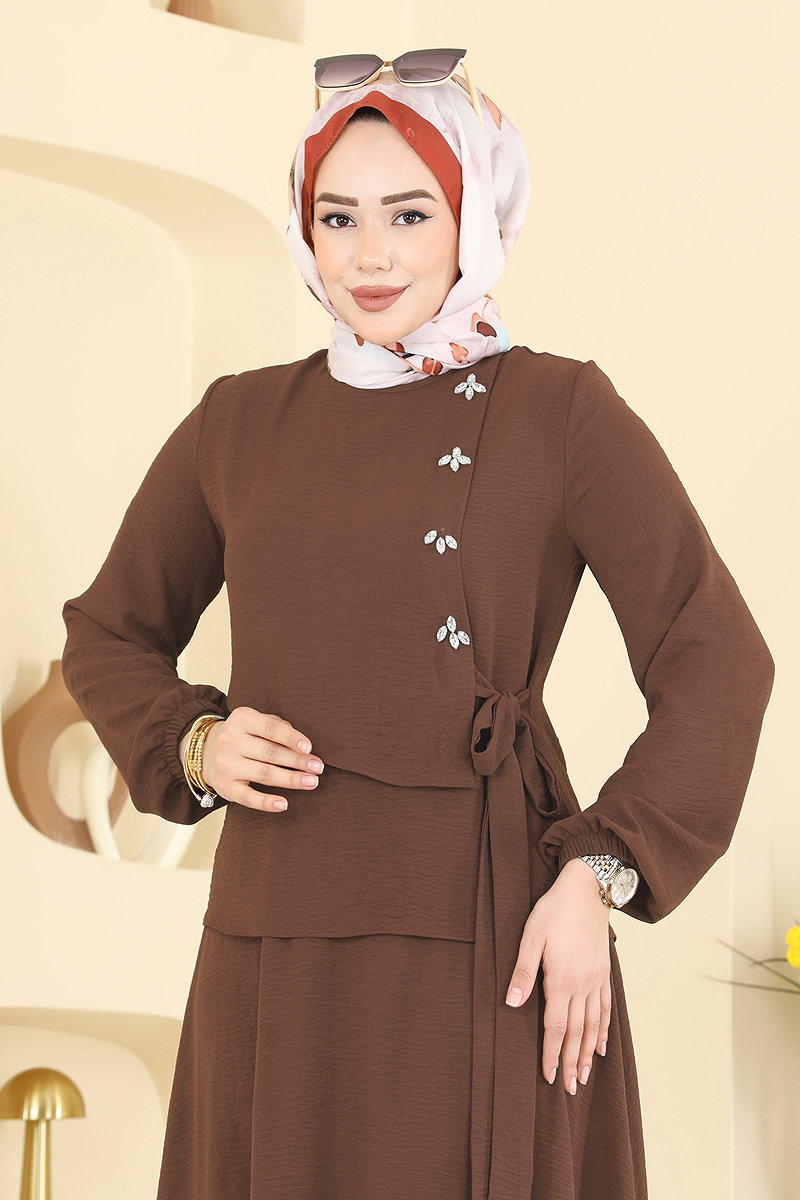 المنتج يحتوي على أربطة جانبية قابلة للاستخدام. يوجد زر يمكن استخدامه من الخلف. المنتج لديه ياقة دائرية. التفاصيل الحجرية محفورة. .خصر التنورة مرن السوار مطاطي. قد يكون هناك اختلاف في الدرجة اللونية في المنتج بسبب التقاط الصور الفوتوغرافية.