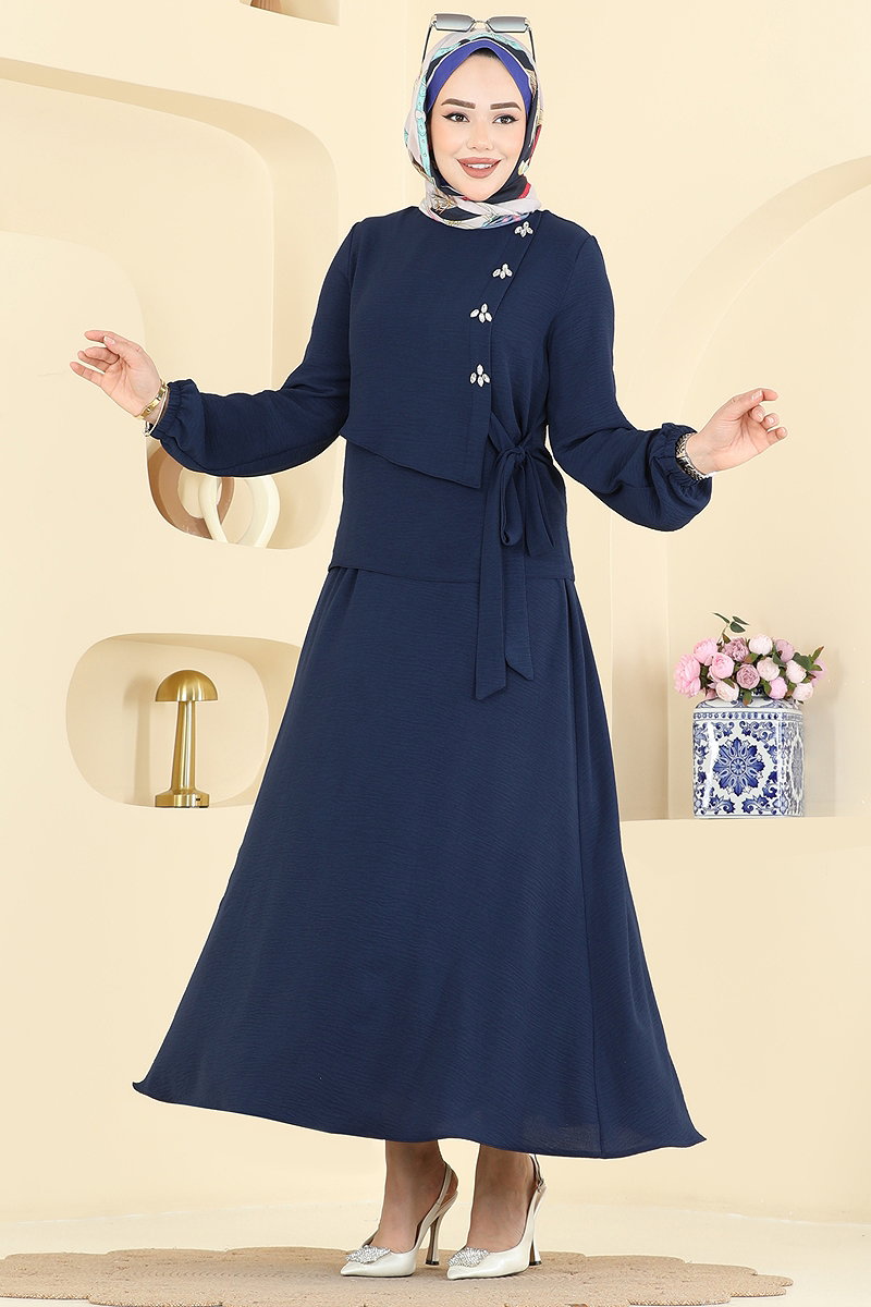 The Stone Detailed Skirt Set COMBINATION is an elegant and comfortable hijab-friendly attire suitable for all seasons. Recommended for delicate wash, this product can be washed at 30 degrees and is made from aerobin fabric. It features a bicycle neckline, adjustable drawstrings on the side, and a button at the back, making it stylish and functional. The stone detailing adds exquisite grace, while the elastic waistband and cuffs on the skirt increase comfort. Its chic, functional design makes this set perfect for everything from special occasions to everyday wear.