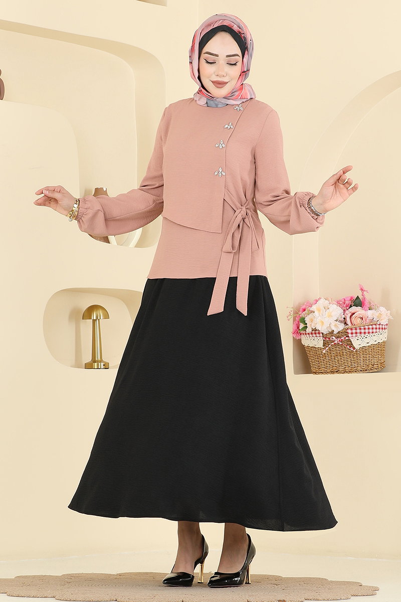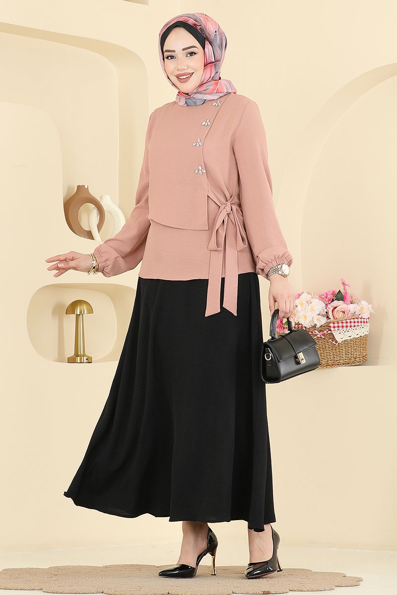 The Stone Detailed Skirt Set COMBINATION is an elegant and comfortable hijab-friendly attire suitable for all seasons. Recommended for delicate wash, this product can be washed at 30 degrees and is made from aerobin fabric. It features a bicycle neckline, adjustable drawstrings on the side, and a button at the back, making it stylish and functional. The stone detailing adds exquisite grace, while the elastic waistband and cuffs on the skirt increase comfort. Its chic, functional design makes this set perfect for everything from special occasions to everyday wear.
