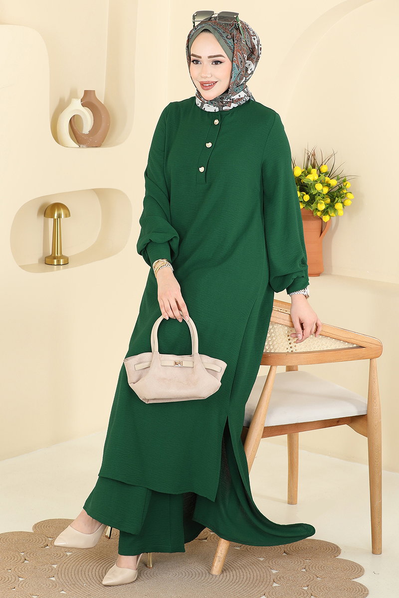 Our Half-Buttoned Front Suit COMBINE model is an ideal choice that reflects the elegant lines of modern hijab fashion. This suit, which can be comfortably used in all four seasons, offers day-long comfort thanks to its specially designed aerobin fabric. It can be cleaned at 30 degrees with delicate washing. The tunic with side slit details offers freedom of movement, while the elastic waistband of the trousers ensures a perfect fit. Its stylish and functional design can be comfortably chosen for everyday use to special occasions.