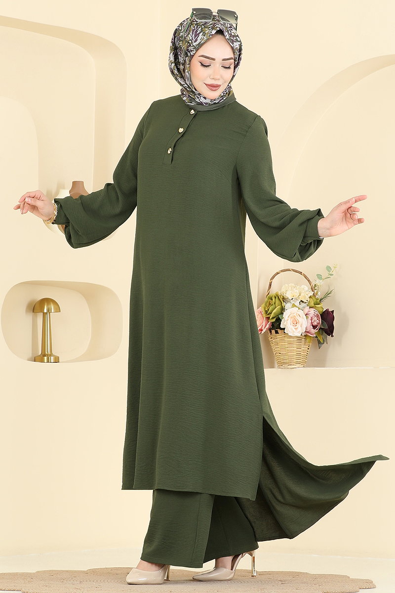 المنتج به أزرار من الأمام. البلوز تحتوي على فتحة. خصر البنطال مرن. قد يكون هناك اختلاف في الدرجة اللونية في المنتج بسبب التقاط الصور الفوتوغرافية.
