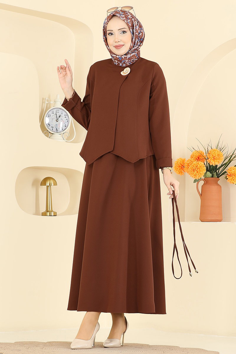 Elegant and practical, the Broş Düğmeli Etekli Takım KOMBİN offers both style and comfort in modest fashion. Suitable for all seasons, this suit is made from woven Dabıl fabric and can be washed gently at 30 degrees. It features a mandarin collar and a button-front design. This unlined suit includes an optional waist tie and comprises both a jacket and a skirt, making it a complete outfit. It's a must-have in every stylish woman's wardrobe, perfect for both everyday wear and special occasions.