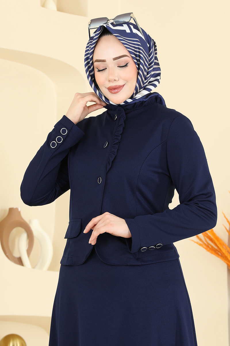 This ruffle-detailed skirted suit offers an elegant option for modest dressing. Suitable for all seasons, this set provides a comfortable experience with its special knit fabric. You can wash it at 30 degrees on a gentle cycle. Featuring a bike collar, half-buttoned front, and zipper details, it offers practicality. Perfect for both everyday wear and special occasions, this ensemble will become a staple in your wardrobe.