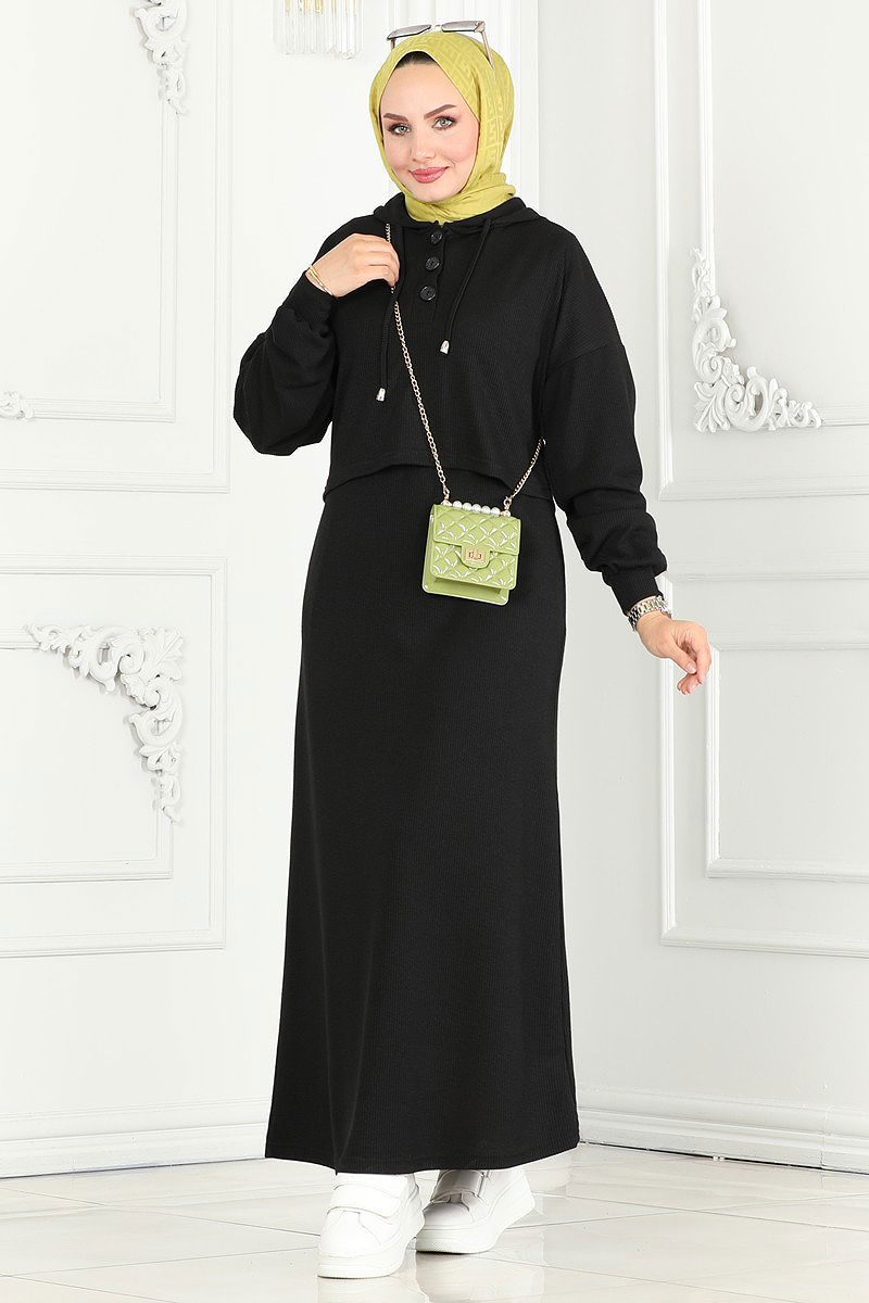 Bolero Detailed Winter Suit model is a hijab product. It can be used in Autumn and Winter seasons. It should be washed at 30 degrees without squeezing. It is made of first-class twist fabric. The product has a hooded collar. The product can be used from the front and is half-buttoned. It is unlined. (The product on the model is size 38.) The inner dress is worn from the head. The inner dress is sleeveless. The hood is sewn to the product.